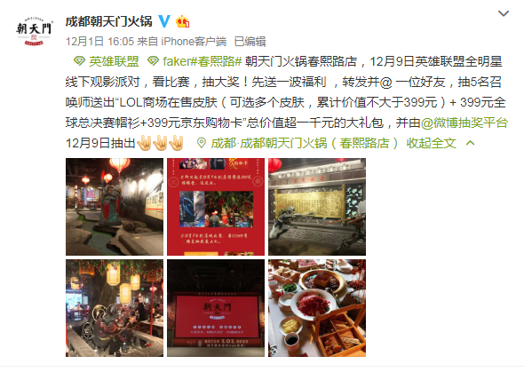 朝天門(mén)火鍋春熙路店,12月9日英雄聯(lián)盟全明星線(xiàn)下觀(guān)影派對(duì),看比賽,抽大獎(jiǎng)!先送一波福利 ,轉(zhuǎn)發(fā)并@ 一位好友,抽5名召喚師送出“LOL商場(chǎng)在售皮膚(可選多個(gè)皮膚,累計(jì)價(jià)值不大于399元)+ 399元全球總決賽帽衫+399元京東購(gòu)物卡”總價(jià)值超一千元的大禮包,并由@微博抽獎(jiǎng)平臺(tái) 12月9日抽出