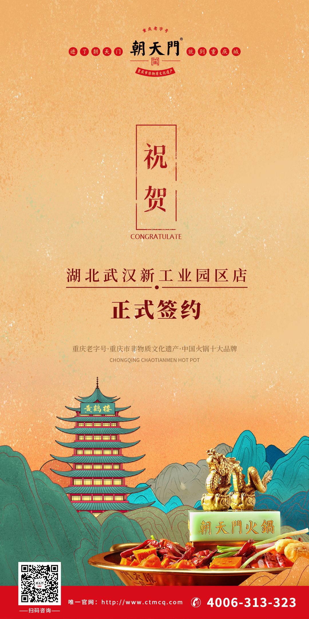 在此,我們?nèi)f分感謝黃總對(duì)朝天門火鍋的信任,接下來(lái),集團(tuán)十二大部門將全力以赴,為黃總的火鍋店做好籌備工作,保障順利開業(yè)。祝生意興隆,財(cái)源滾滾!