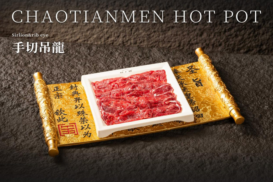 「朝天門(mén)火鍋」的菜品不少都帶有彷如頒布詔書(shū)的濃厚儀式感,如經(jīng)典菜品「手切吊龍」,上菜時(shí)用聖旨端著,非常有排場(chǎng)。吊龍是牛脊背上的一條長(zhǎng)肉,接近牛頸脊的位置,占全牛比例僅4%,為多款位置中肉味最濃的部位,油份較重,肉質(zhì)彈牙。另一道人氣菜品,將黃喉置於烽火臺(tái)之上,引經(jīng)據(jù)典取名為「烽火戲豬喉」,豪爽夠霸氣,黃喉口感爽脆彈牙,帶淡淡肉香。