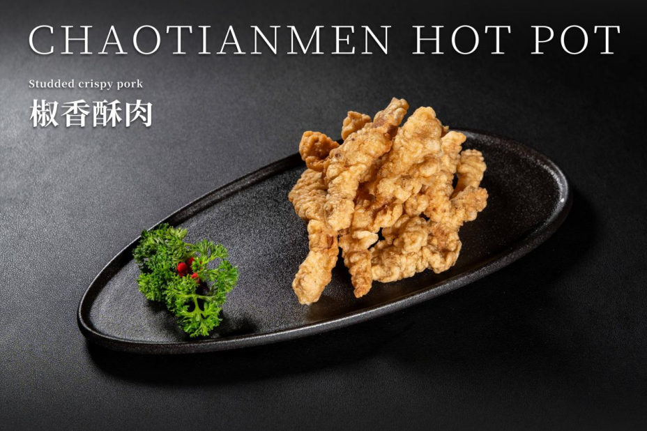 正宗重慶人在火鍋沸騰前多會(huì)點(diǎn)一份炸酥肉作開(kāi)胃小吃。朝天門(mén)火鍋的「椒香酥肉」以五花肉為主料,蘸上蛋漿即炸,表面再撤上麻椒顆粒,香脆可口,味香爽麻,令人回味無(wú)窮??杉词骋部煞湃牖疱佒袪C煮,吸入辣汁後肉質(zhì)香辣軟腍,雙倍滋味。